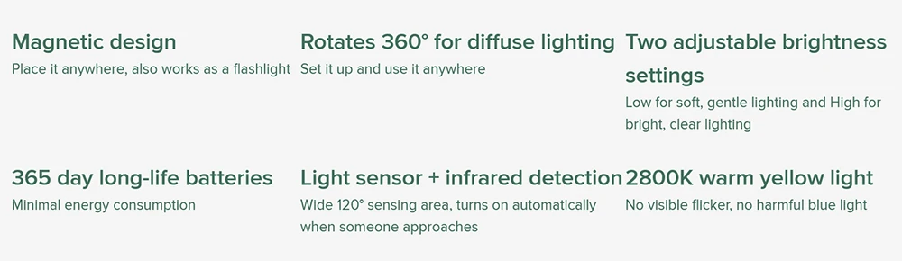 Baterías de larga duración de 365 días/sensor de luz + detección infrarroja/luz amarilla cálida de 2800K