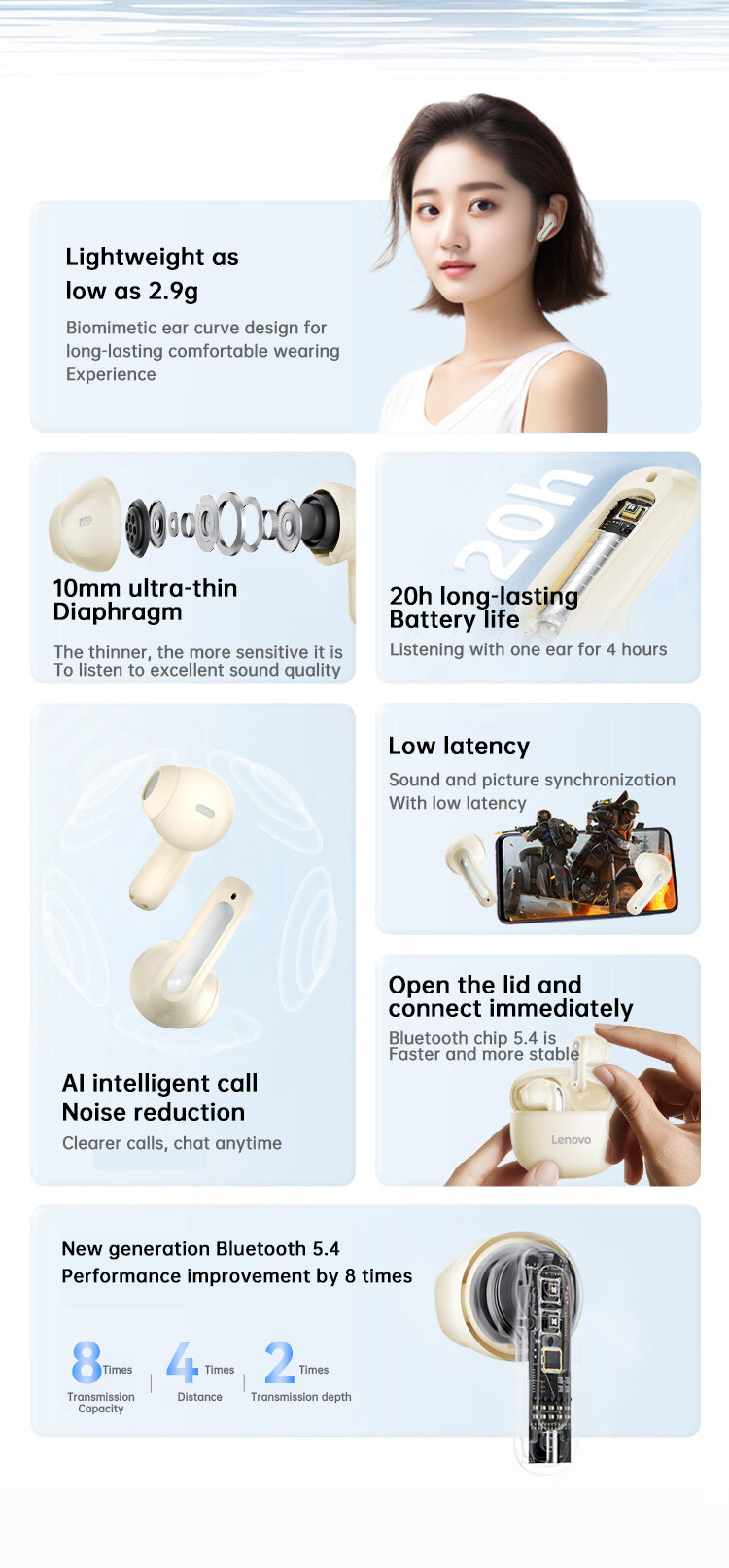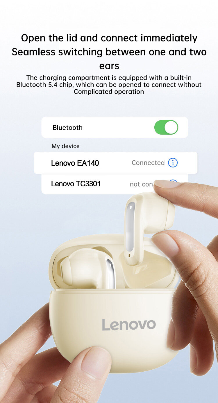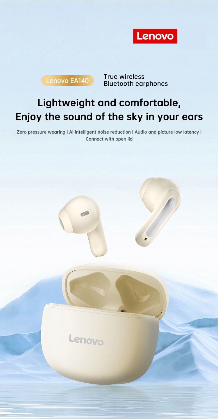 Product description:Lenovo EA140 TWS Earbuds Wireless bluetooth 5.4 Earphone 10mm Diaphragm AI Call Noise Reduction 20H Playback Low Game Latency Semi-in-ear Sports Headphones