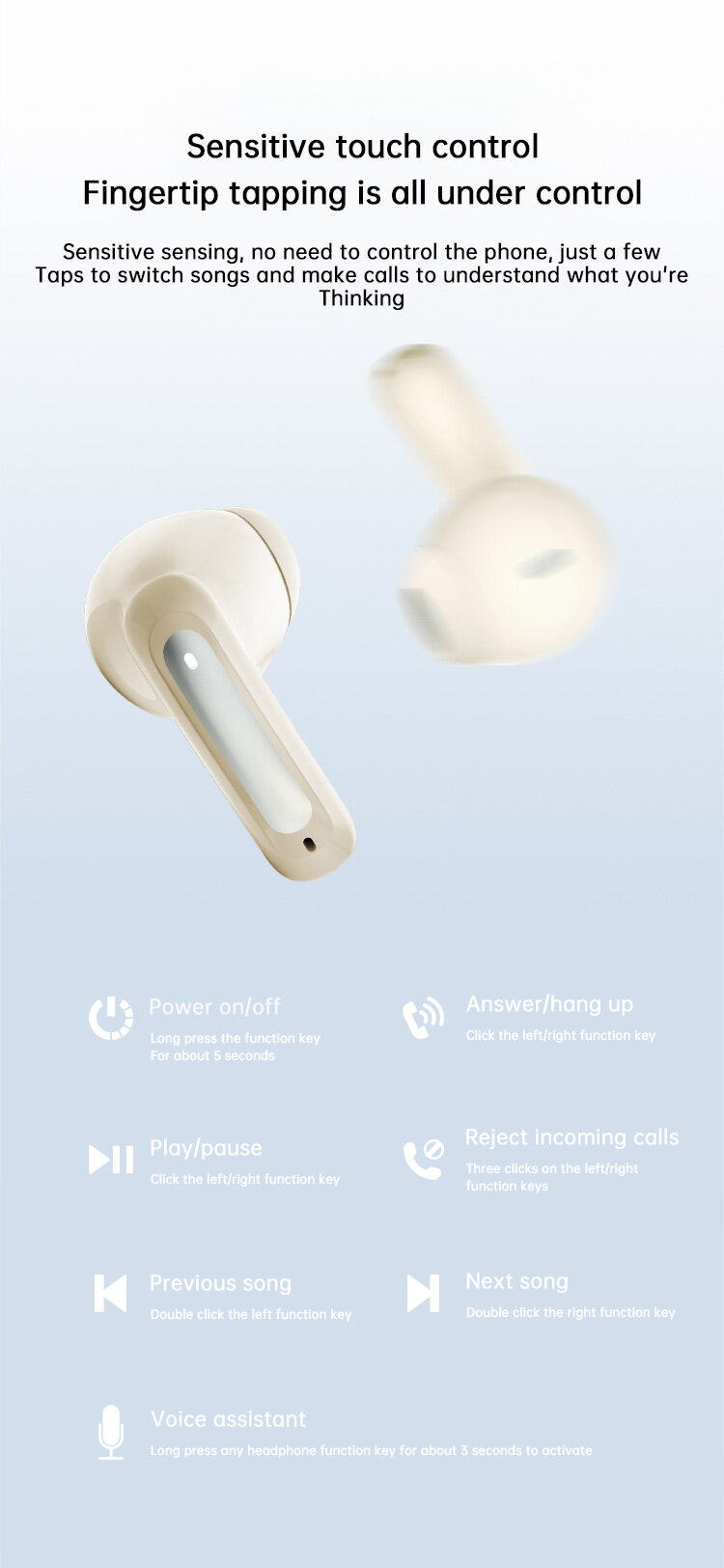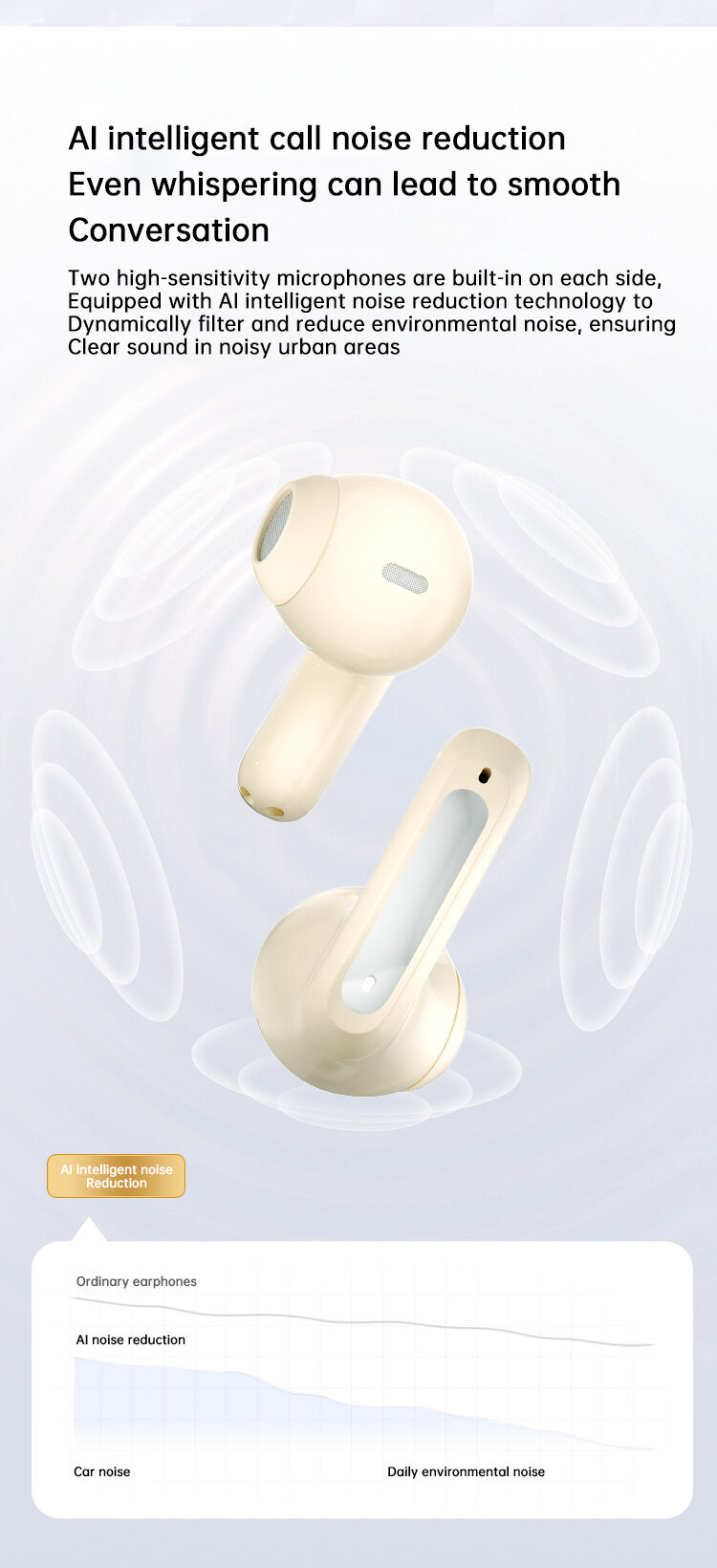 AI Call Noise Reduction: Featuring AI intelligent call noise reduction, these earbuds ensure crystal-clear conversations. The built-in microphones effectively reduce environmental noise, allowing you