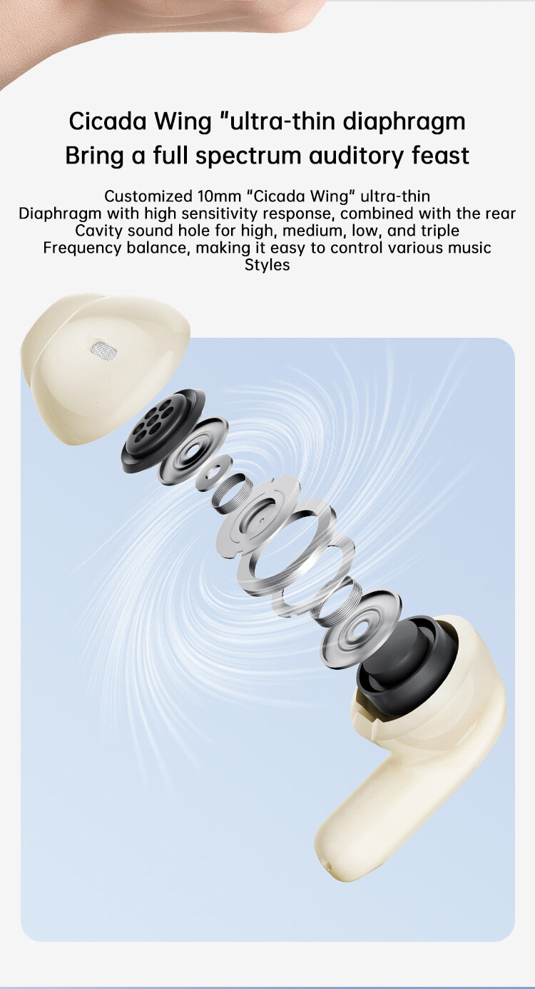 10mm Ultra-Thin Diaphragm: Equipped with a highly sensitive 10mm diaphragm, these earbuds deliver exceptional sound quality with crisp highs, balanced mids, and deep lows, providing a full-spectrum au