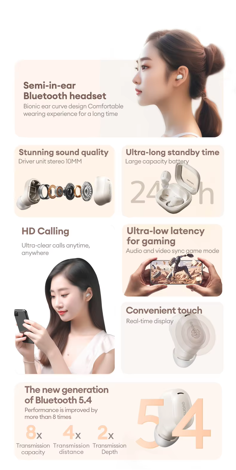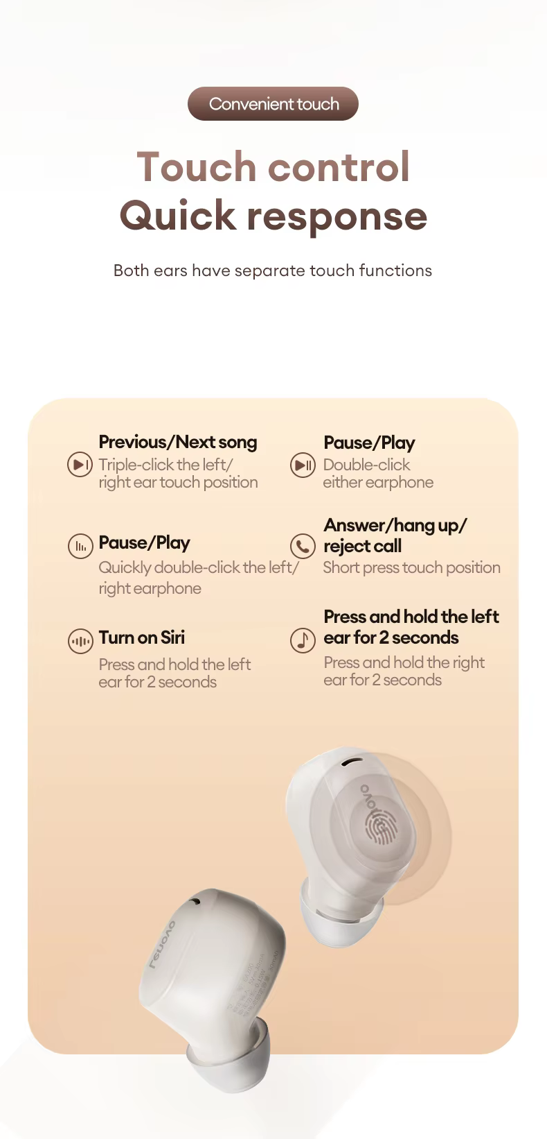 Touch Control: Navigate your audio with ease using intuitive touch controls. Play, pausing, skip tracks, and take calls with simple touch gestures, making your experience more convenient and enjoyable
