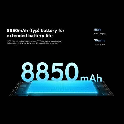 Product description: POCO Pad X1 is equipped with a massive 8850mAh battery, providing long-lasting battery life that can deliver over 10.9 hours of video streaming. 8. 45W.