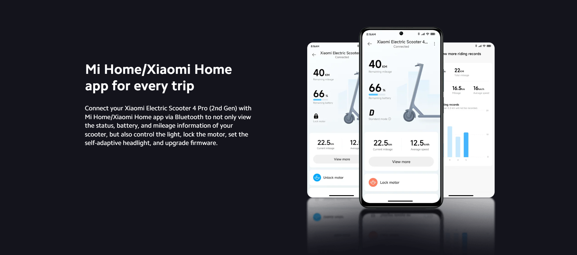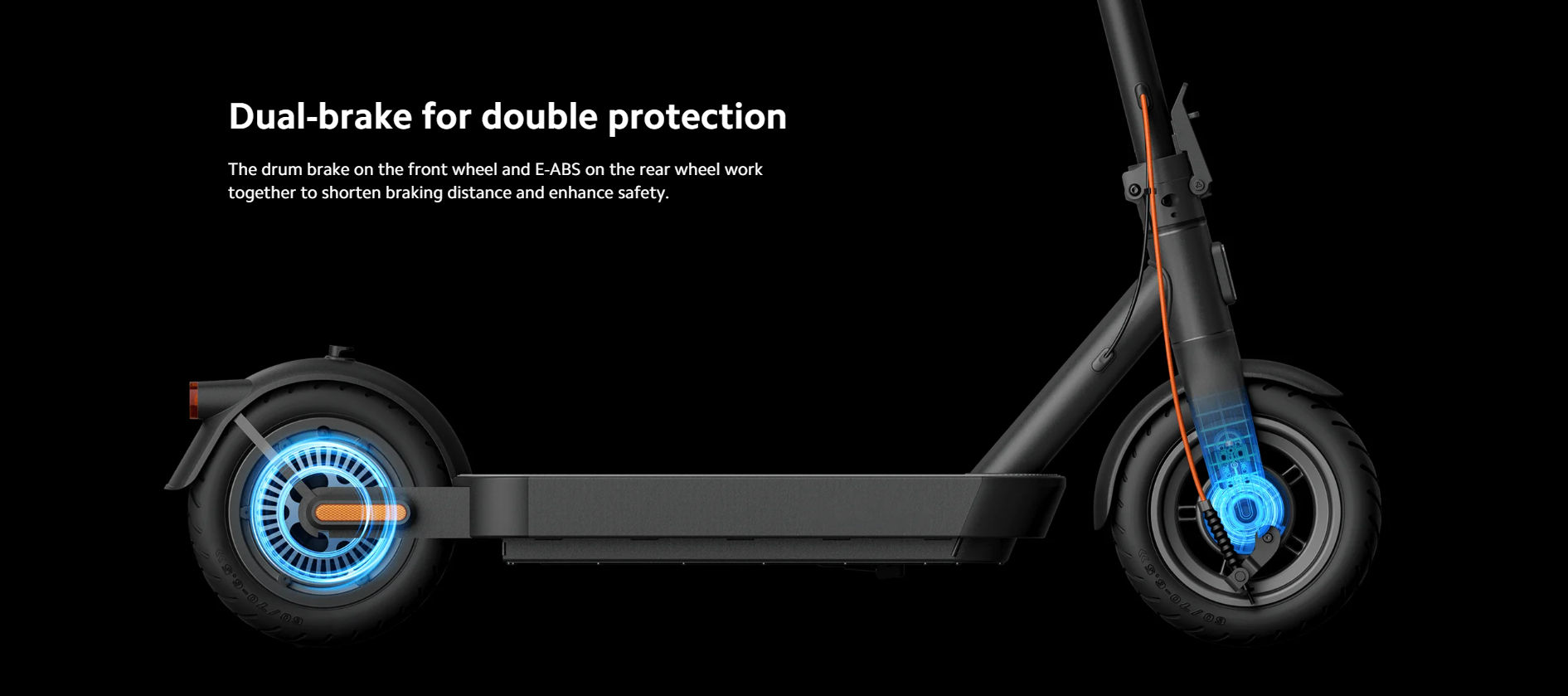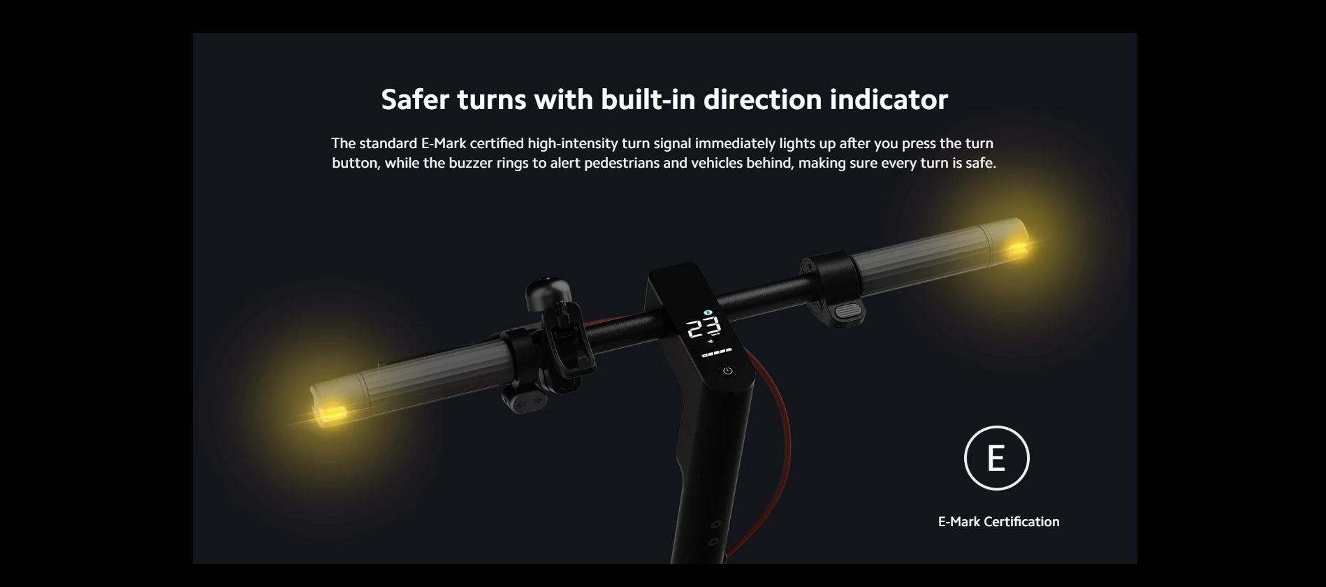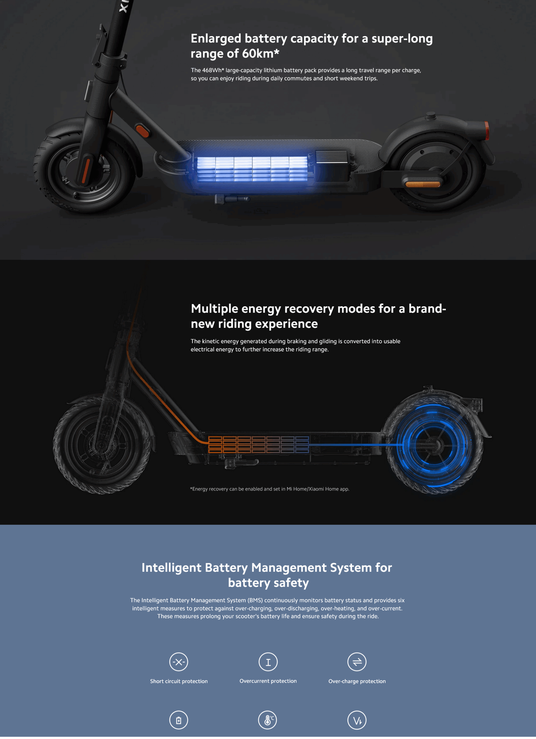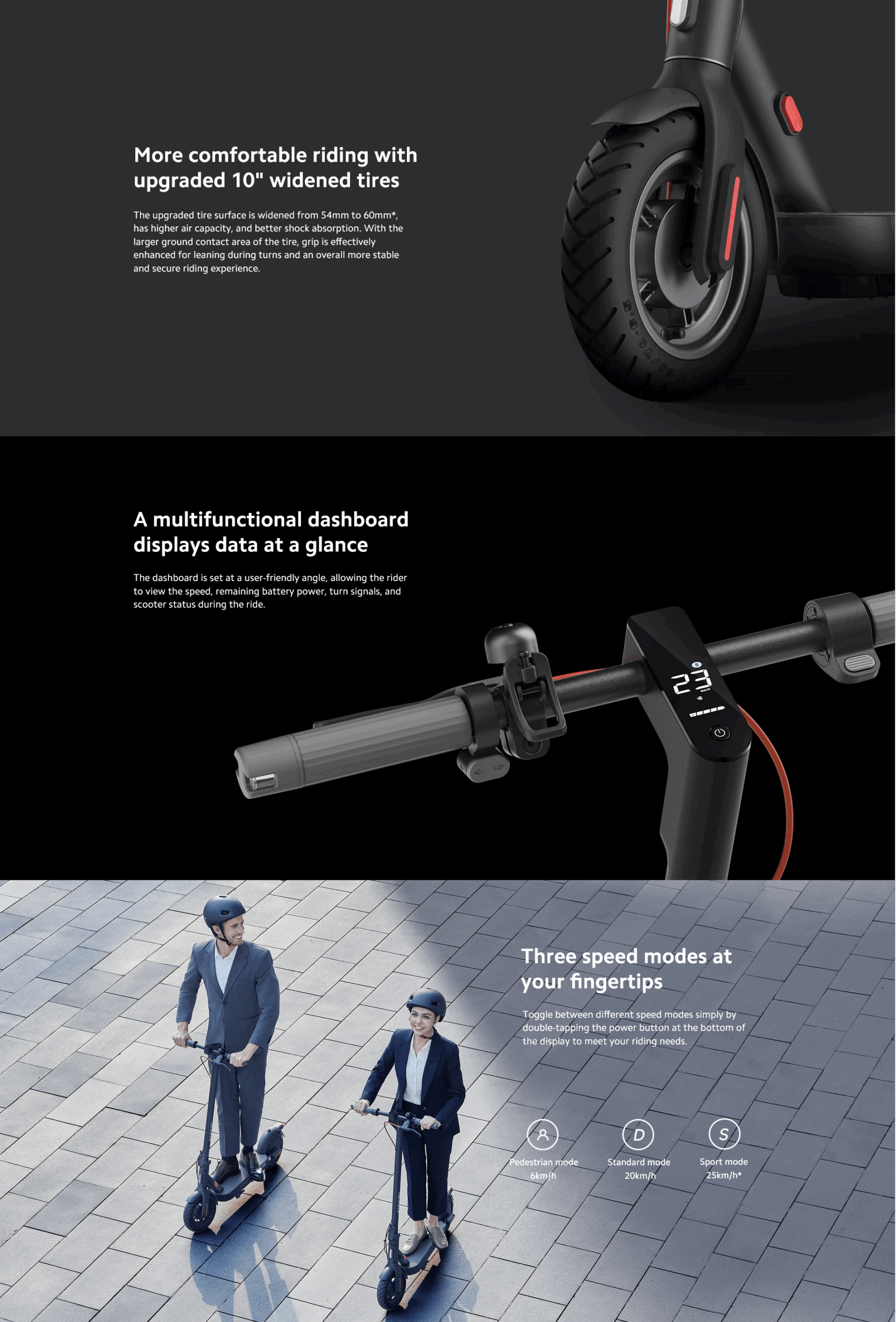 *Pedestrian mode: 6km/h. Standard mode: 20km/h. Sport mode: 25km/h. At (25±5)°C and an average wind speed of ≤3m/s, with a total load of 75kg±5kg and a battery level of 70%±10%, the scooter accelerated in an auxiliary driving area and maintained max. speed upon reaching the test area. The max. speed in the test area was measured with a tachometer or Bluetooth and a dashboard, respectively. Data is tested by manufacturers.