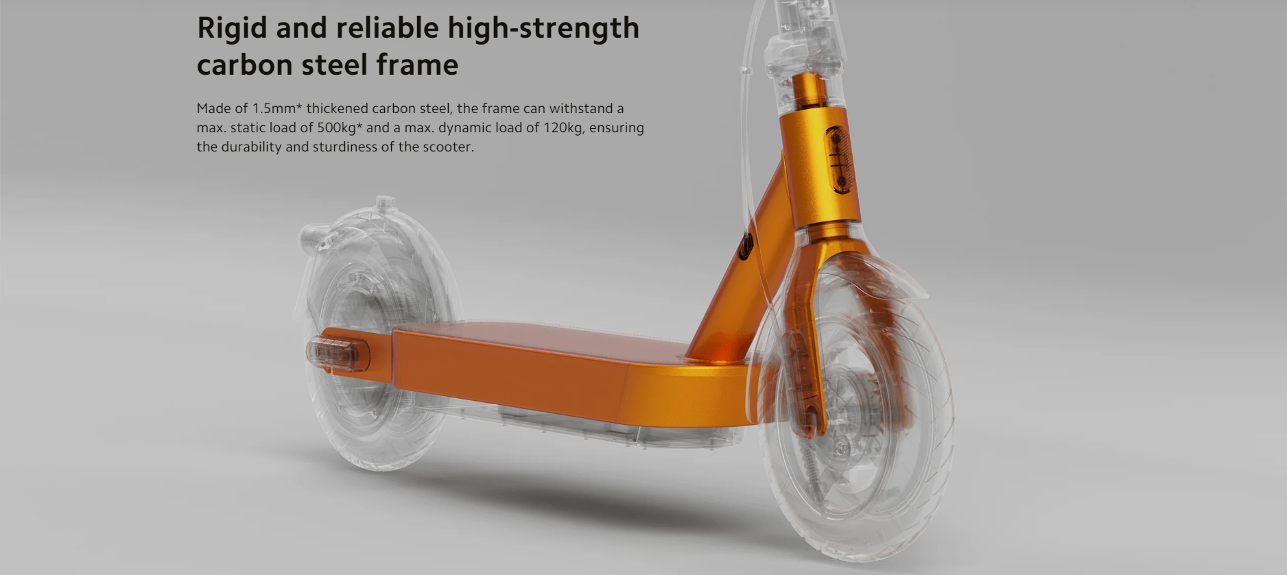*500kg static load: When the scooter was in a stationary state, a load of 500kg was applied to the center of the deck, with a loading area of 100mm x 100mm. The static load was maintained for 5 minutes. After the test, the frame components were inspected for any visible cracks, fractures, or deformations. Data is tested by manufacturers.